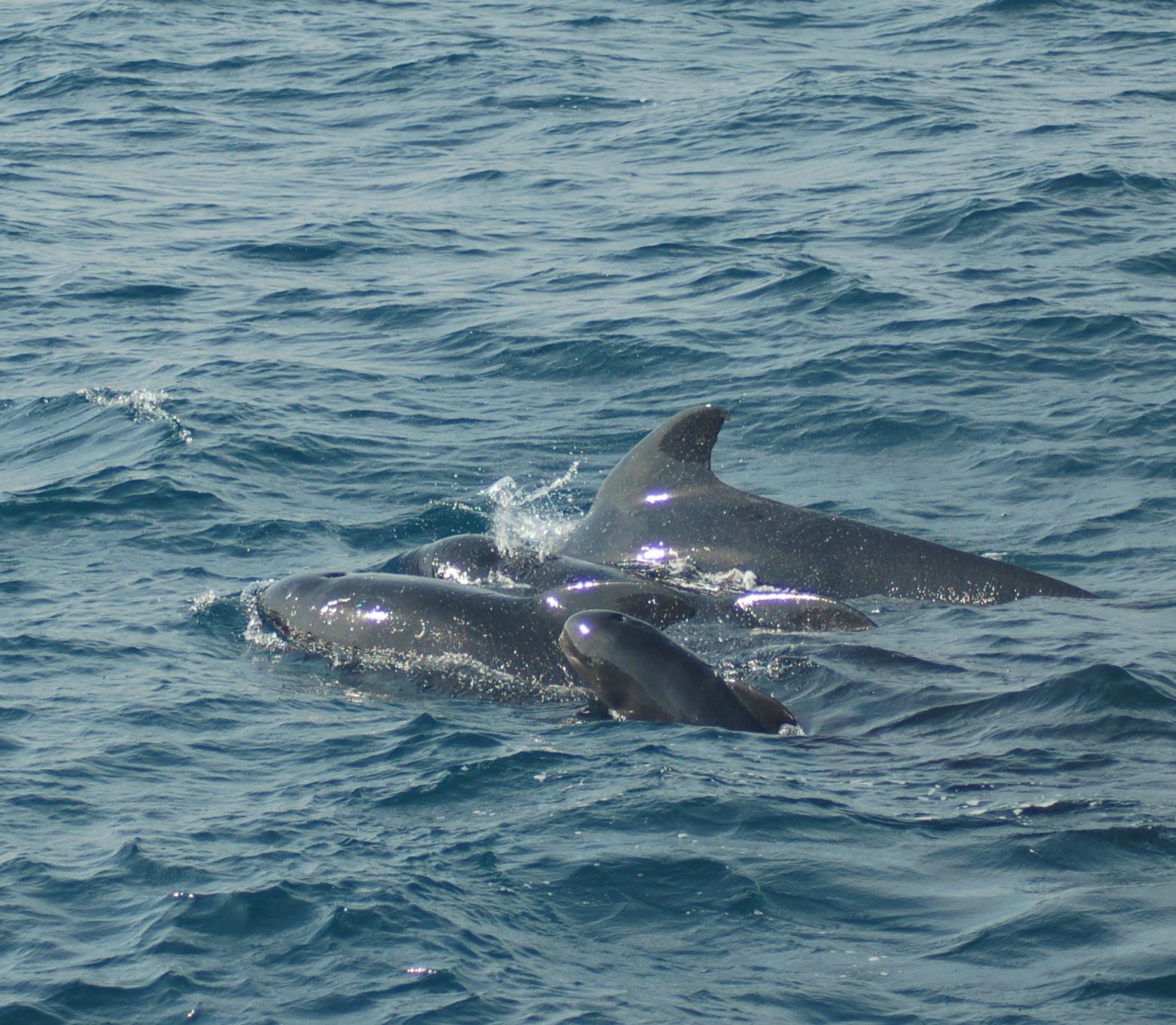 un grupo de delfines listados, un grupo de unos 1000 – 1500 individuos, con crías de poco más de una semana. Estos